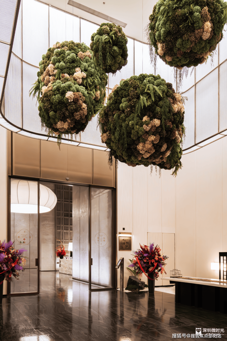 曲径通幽抵达前厅花园,抬头是九朵永生巨型花球簇拥而成的吊顶,尽显自然雅趣。