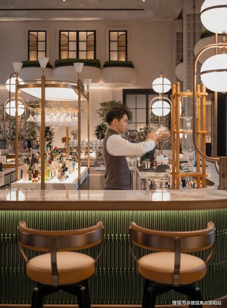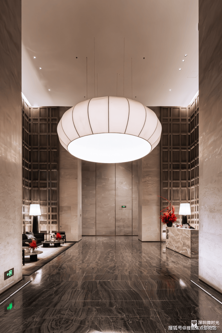 步入首层大堂,奢级酒店才有的挑高,方正气派,不见奢石堆砌,沉稳色调给人以古朴的质感。与巨型“玉盘”吊灯,形成“天圆地方”呼应,也与深超总和谐共生理念的共振。