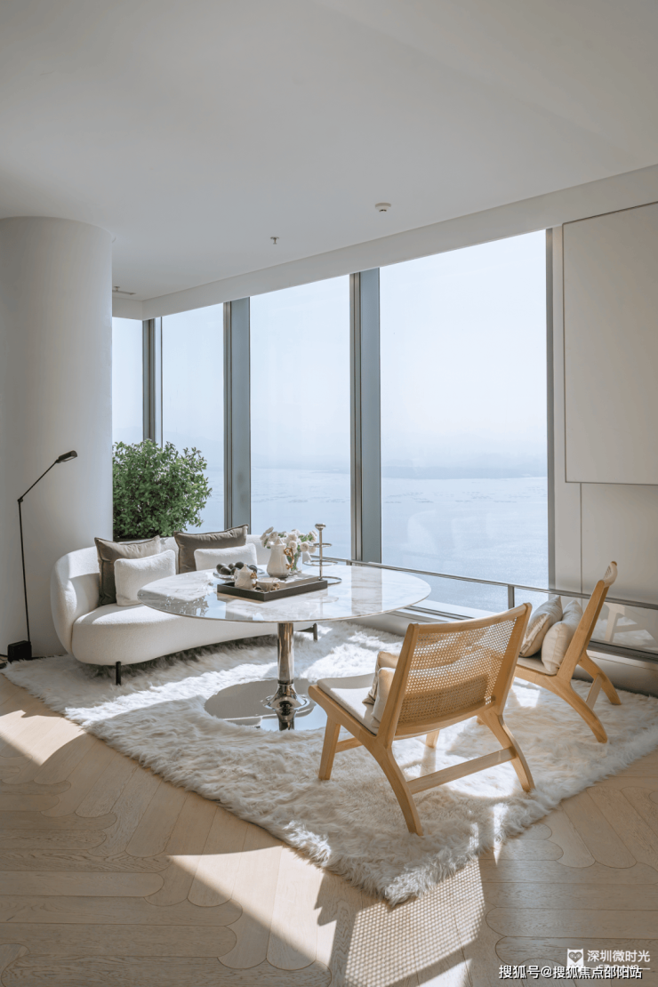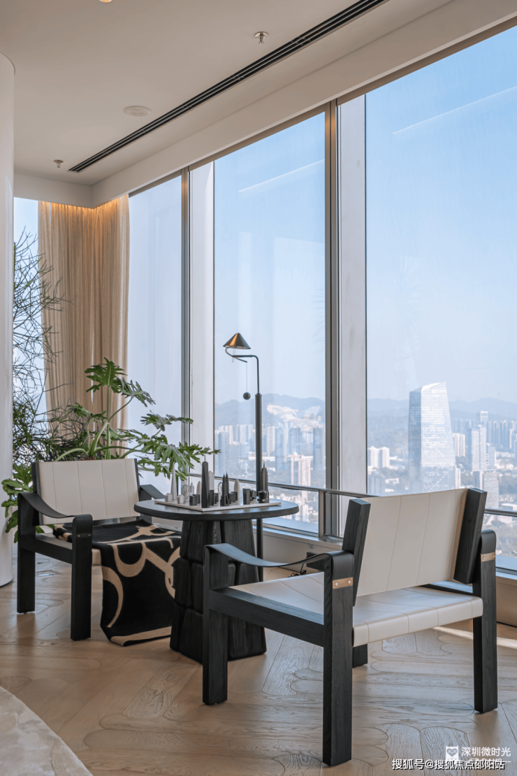 南向的深圳湾海景、东向的华侨城湿地、北向的塘朗山脉、脚下的沙河高尔夫——这“山、海、湿地、城”四重极景,都成了窗前流动的画卷。城市的喧嚣已被云端隔绝,留下的只有静谧与掌控感。