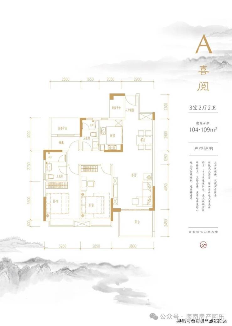 【A户型】:建筑面积约104-109㎡,3室2厅2卫
