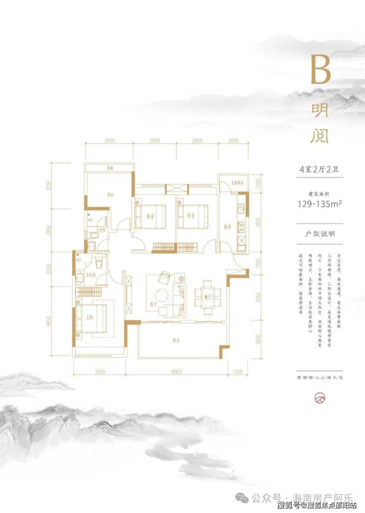 【B户型】建筑面积约129-135平米,4室2厅2卫
