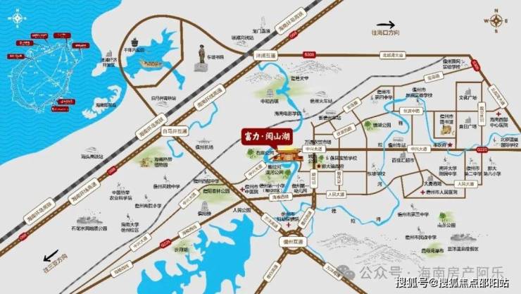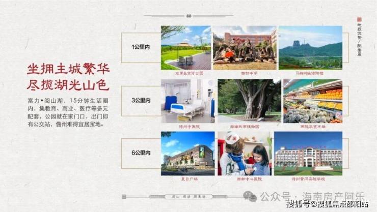 海南富力·阅山湖,坐落海南西部的明星城市儋州市,具体位置在中兴大道西段,这里是城市的主动脉,交通十分便利。从项目出发,前往万洋高速出入口仅需2公里的路程。海南西线高速和环岛高铁如同血脉一般贯穿整个区域,项目距离白马井高铁站只需要约35公里即可抵达。至海口和三亚的距离分别为约120公里和约220公里。 阅山湖所在的区域被规划为儋州市城西的核心功能区,是市政府重点打造的那大主城区的重要部分。这里未来的定位是集高端住宅、顶尖教育、先进医疗、休闲娱乐、繁华商业于一体的城市综合体。 该项目的建设依托于周围优美的原生态自然风景,西靠马鞍岭和儋阳楼,远眺云月湖的美景,近听雅拉河的潺潺流水。项目南临多所学校,如儋州一小、海南西部中学、儋耳学校以及海南大学儋州校区等,教育资源丰富。结合这些得天独厚的条件,阅山湖必将成为儋州首个人文豪宅的标杆项目。