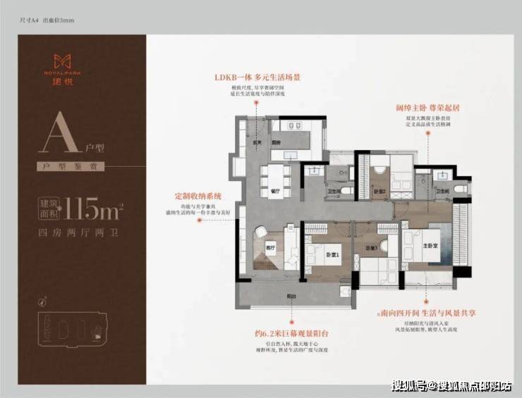 115㎡的4房2厅2卫,A户型(1栋1单元05户型),设计的是经典竖厅格局,进门入户玄关,LDKB一体化,S墙设计预留冰箱卡槽位,四开间朝南,动静分区,主卧双面飘窗,客厅连接次卧出6.2米长的巨幕大阳台,U型厨房,公卫三段式分离,得房率76.77%(不含赠送),套内面积88.71㎡,东南朝向,靓点是2个最小的次卧都不用睡飘窗。