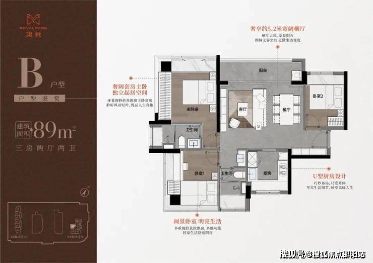 89㎡的3房2厅2卫,B户型(1栋1单元07户型),设计的是横厅南北通透格局,进门入户玄关,客餐厅5.2米开间,LDKB一体化,S墙设计预留冰箱卡槽位,三开间朝南,主卧+1个次卧双面大飘窗,客餐厅出5.2米宽景阳台,U型厨房,公卫三段式分离,得房率76.77%(不含赠送),套内面积68.95㎡,阳台主朝西北向。
