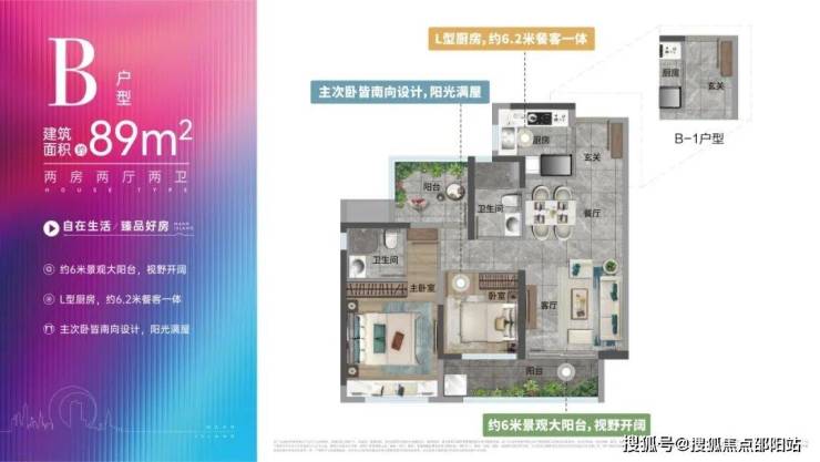这个户型做了大横厅设计,且五开间朝南、南向大阳台连接客厅与次卧、玄关带飘窗、主卧带南北双飘窗,都大大提升了室内采光。