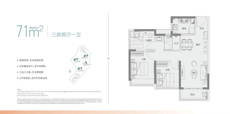 71㎡的3房2厅1卫,设计的是竖厅格局,餐客厅一体化,动静分区,客厅3.1米开间,3个卧室分别做到了主卧10.64㎡/次卧7.83㎡/次卧7.56㎡(包含墙体飘窗),U型厨房,卫生间三段式分离设计,得房率:78.19%(不含赠送),阳台进深1.25米,有东北或西北向。