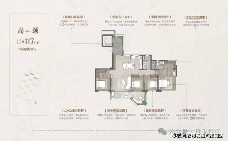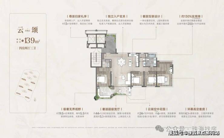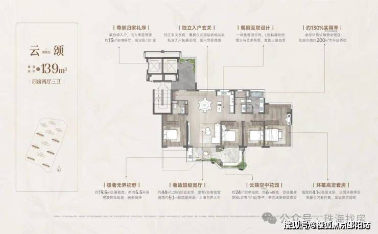 四代洋房·奢享写意人生 | 双入户大堂、一梯一户,稀缺至高约130%实用率(不含电梯厅),6面朝南,270°环幕采光,定制约6m错层空中浮岛,奢享墅质生活