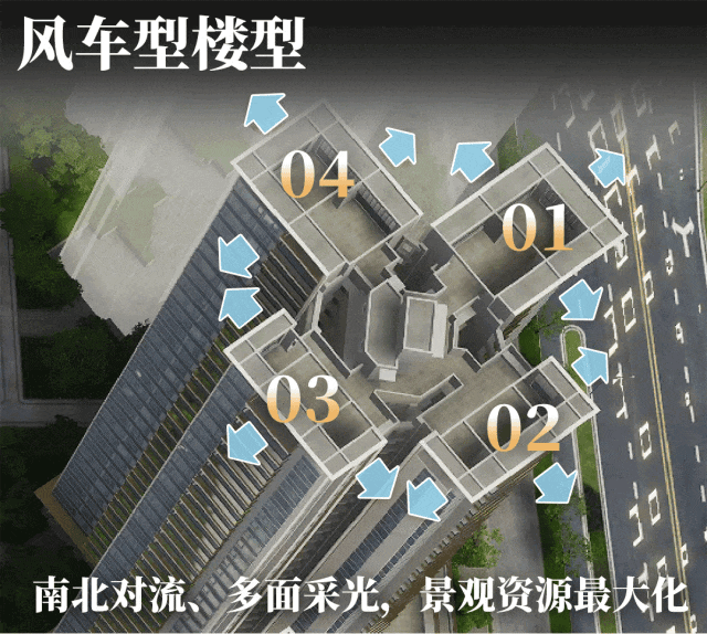 ▍一方面,通过独特的风车式布局,将四户以45°角向外延展,实现三面采光,形成互不干扰的独立居住单元。