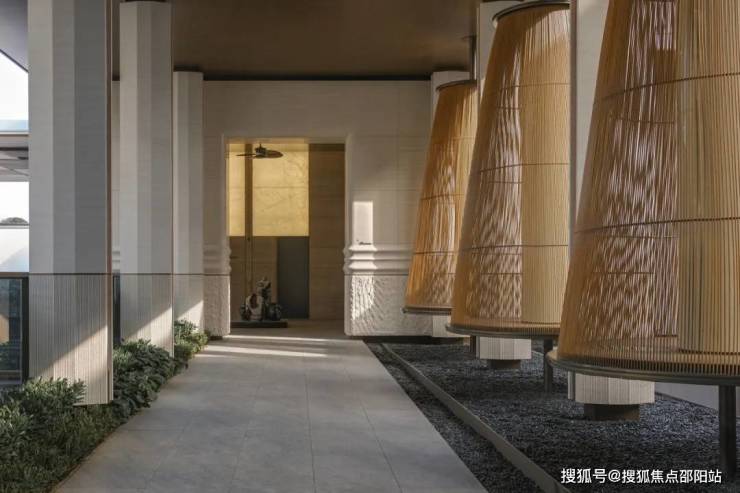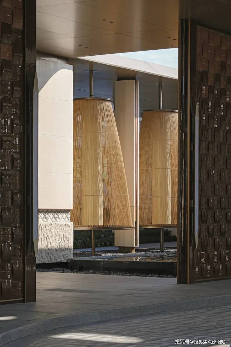 柱体表面采用米白色石材,内嵌红色洞石,散发柔和暖光。柱间空隙巧妙地将视线引向内部庭院的绿意与远处的女王厅,形成强烈的视觉穿透感。