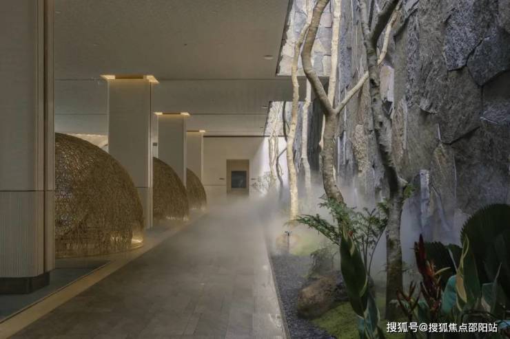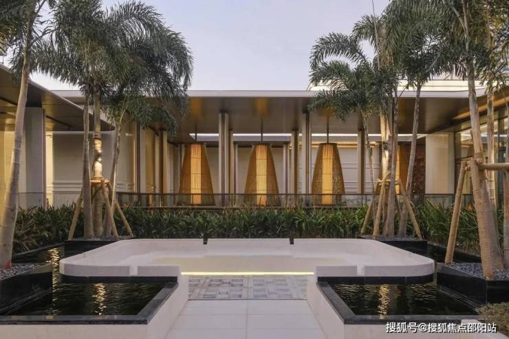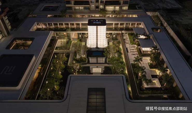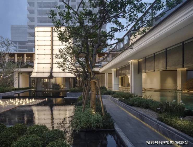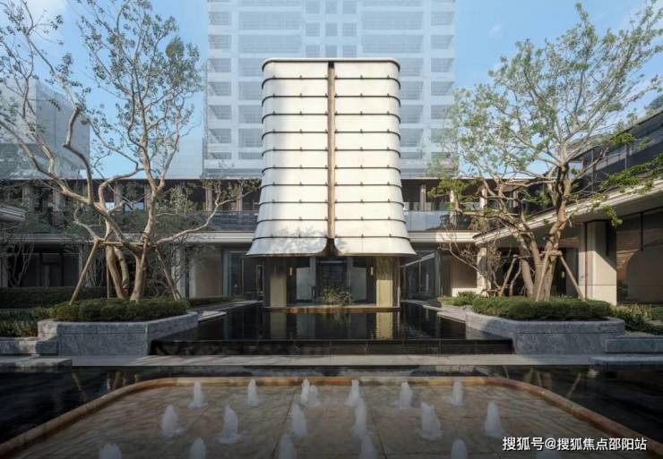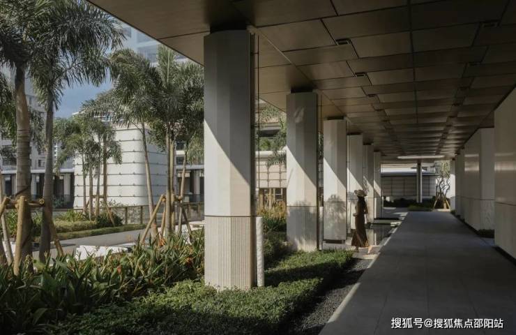 穿过归心长廊,便抵达项目"心脏地带"——中庭花园。这里被设计为开放流动的生态空间,将建筑、水景、植物与光影融为一体。花园以贯穿南北的镜面水道为核心,两侧设置方形花坛,种植形态优雅的乔木。环绕花园的是连续廊道系统,连接各功能区。
