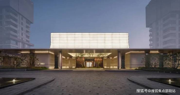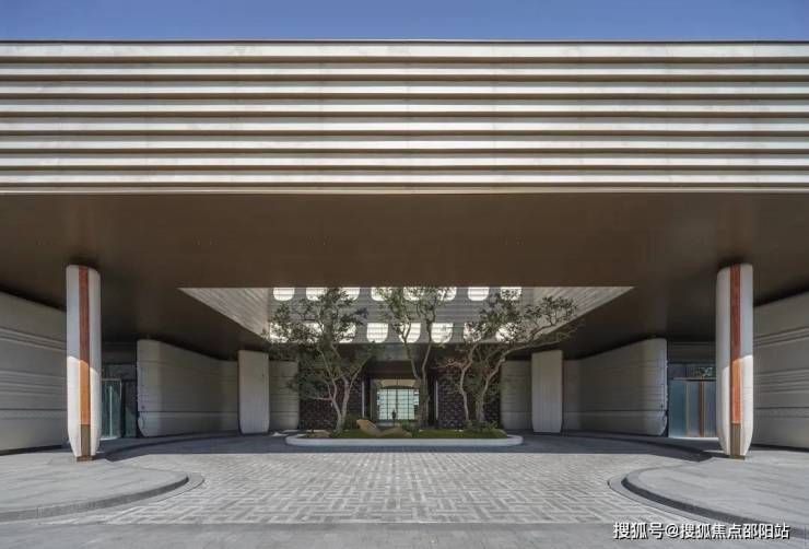 入口广场以人字形铺陈的石板地面为中心,两侧设低矮水渠。主入口摒弃了传统高耸大门或厚重墙体,代之以四根轻盈的弧形柱体,支撑起悬挑屋面。