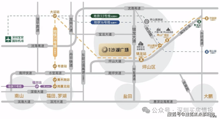 地铁:紧邻地铁14号快线坪山门户站——锦龙站700米(已通车),12站福田岗厦北。地铁16号线(预计2022年内通车)、地铁33号线(在建)