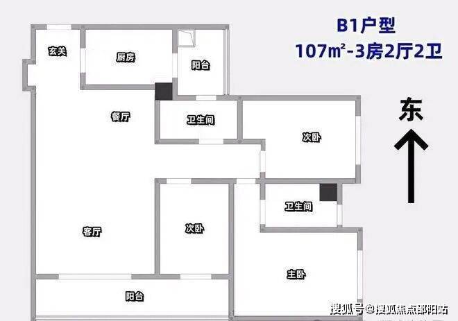107㎡的3房2厅2卫(B2户型,1栋4单元03/04户型)设计的是经典竖厅格局,进门独立玄关,客厅3.5米开间,LDKB一体化设计,动静分区,3个卧室分别做到了3.15米/2.85米/2.65米的宽度,客厅连接次卧出6.35米长的大阳台,二字型厨房还带1个小生活阳台,得房率75-77%(不含赠送),阳台有朝西向、朝东向或朝南向。