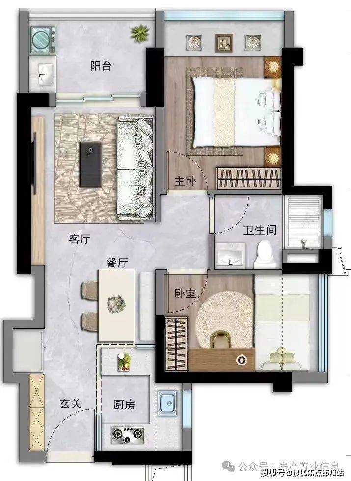 约63㎡2房2厅1卫:竖厅设计,进门入户玄关,S墙设计预留冰箱位,U型厨房,餐客厅一体连接阳台,卫生间干湿分离,阳台西北朝向。