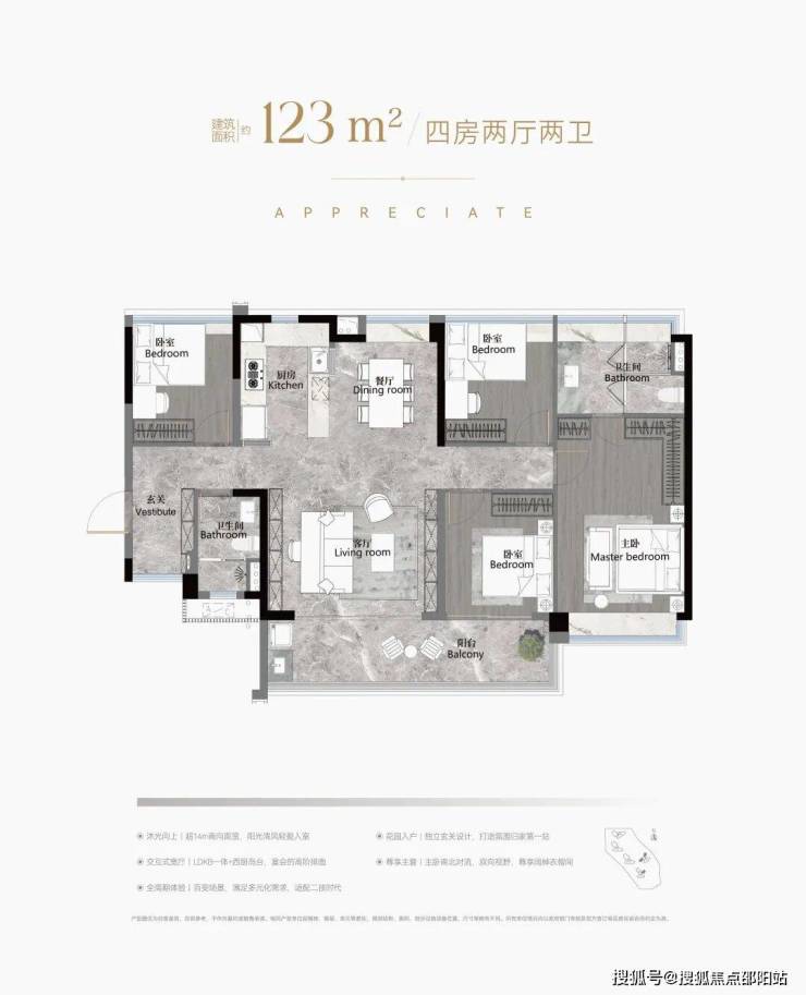 建面123平四房两卫,南北对流户型,LDKB一体化设计,约7米长景观阳台,主卧设置L型衣帽间,三个次卧差不多大小,转角玄关用作收纳。