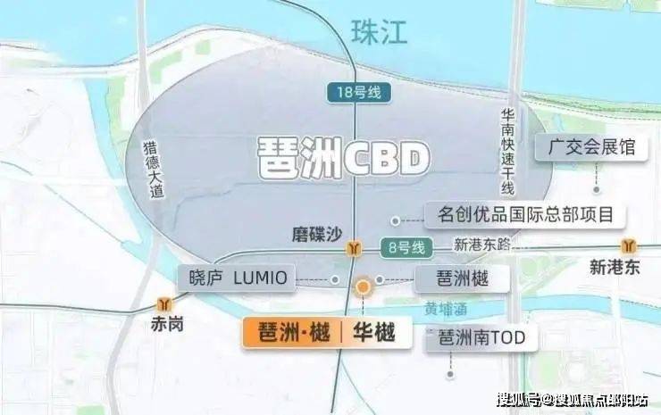 项目位于海珠区琶洲西,紧邻地铁8号线与18号线交汇的磨碟沙站,步行直线约200米。
