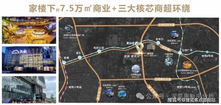 家楼下约7.5万方社区商业,下楼即可满足生活所需;3KM²内,3大都市核心商超环绕,大仟里、天虹(光明/松岗)