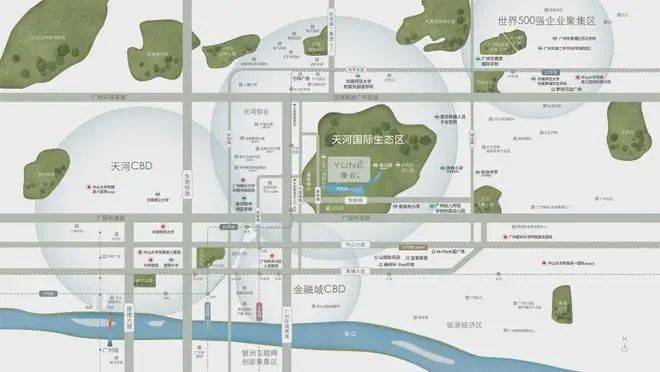 缦云广州择址天河国际生态区核心,与两大经济引擎天河CBD和金融城CBD,保持约6公里的直线距离。
