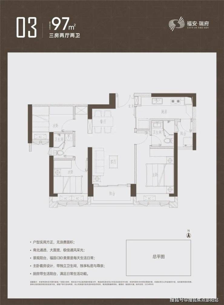 97-98㎡3房两卫户型为双龙抱珠格局;