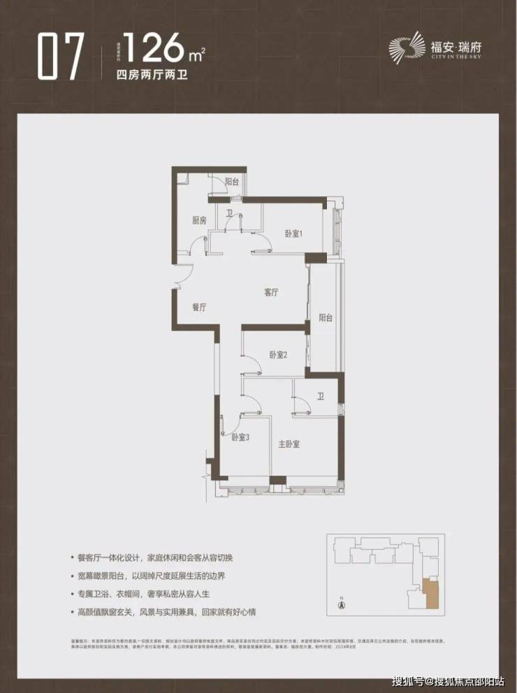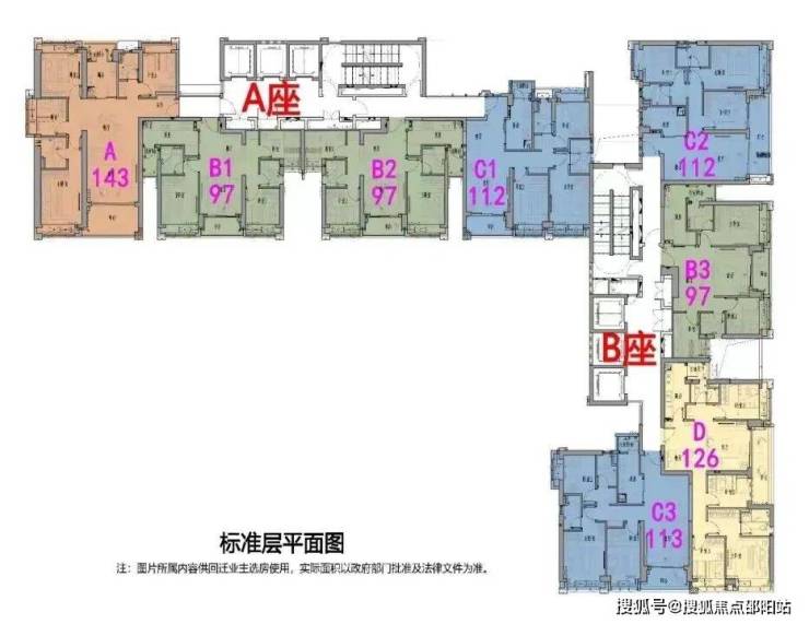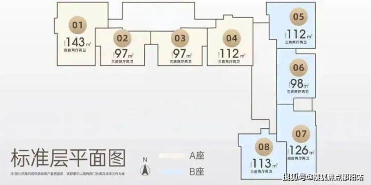 户型图如下,主推建面约97-98-112-126-143㎡的3-4房产品,户型均设计有双阳台、双套房。