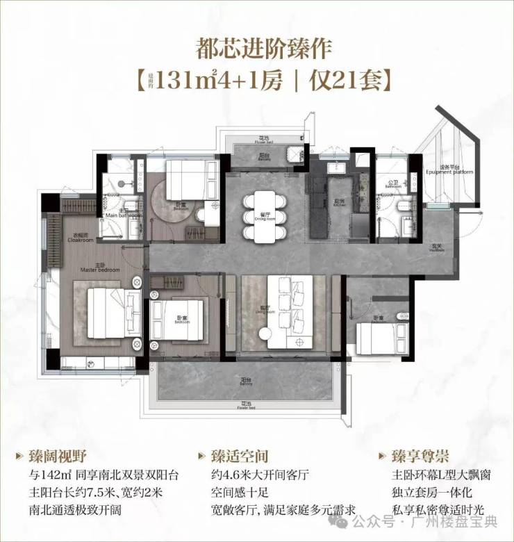 建面131平4+1房,该户型跟之前142平户型有点像,南北对流双阳台,主阳台长达7.5米,约4.6米的客厅开间,加上设备平台的赠送,空间感完全不输160平。