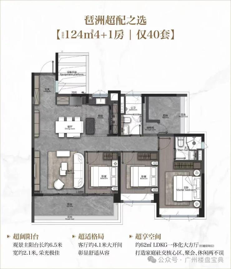 建面124平四房,约6.5米的宽景阳台,客厅开间约4.1米,由于设备平台全赠送做到了大客厅、大阳台之外还能改做4+1房。广铁珑璟台售楼处电话:400-892-2273