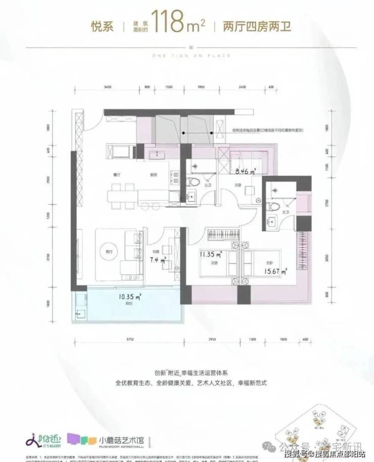 118㎡的4房2厅2卫,1栋2单元02户型,设计的是竖厅格局,进门约6.12平的入户玄关位,客厅3.5米开间,LDKB一体化设计,四开间朝南,动静分区,分别做到了主卧15.67㎡/次卧11.35㎡/次卧8.46㎡/次卧7.4㎡(包含墙体飘窗),客厅连接次卧出5.75米长的大阳台约10.35平,U型厨房,公卫三段式干湿分离,得房率约96.5%(包含赠送),东南朝向。这个户型区别之处在于公卫,卧室,飘窗赠送面积14.31㎡+阳台赠送面积5.17㎡=实际赠送19.48㎡。
