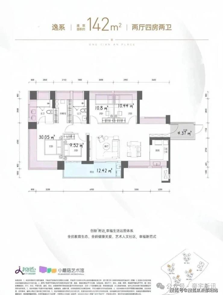 142㎡的4房2厅2卫,2栋1/2/3单元02户型,设计的是横厅南北通透格局,独门独户,赠送约4.37平的入户空间,客餐厅7.3米开间,LDKB一体化设计,五开间朝南,主卧带大衣帽间,分别做到了主卧30.05㎡/次卧10.8㎡/次卧10.44㎡/次卧9.52㎡(包含墙体飘窗),客厅连接次卧出6.9米长的大阳台约12.42平,U型厨房,卫生间干湿分离,得房率约104.2%(包含赠送),西南或东南朝向。飘窗赠送面积23.8㎡+阳台赠送6.21㎡+外廊赠送4.37㎡=实际赠送34.38㎡。