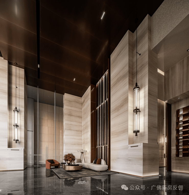 约9米高朗阔入户大堂,汲取明阔开朗的岭南建筑气质,奢雅的仿古铜色大门之外,立面色调以浅色石材中性色为主,摒弃多余而浮夸的修饰,将广府气韵浓缩其中,整体呈现出古今相宜的尊贵,兼顾艺术感与审美细节。