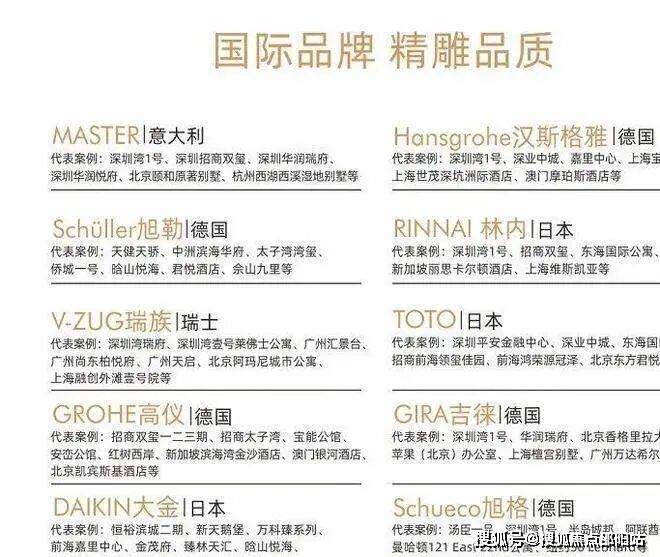 甄选世界知名精装品牌,引领奢宅标准前沿;例如:瑞族、大金、MASTER、汉斯格雅等国际一线品牌。配备全屋智能化系统。