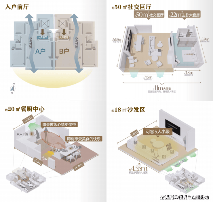 餐客厅一体化设计动线流畅,加上市面上相近户型少有的面宽约5.8m超阔横厅,将空间感无限放大。