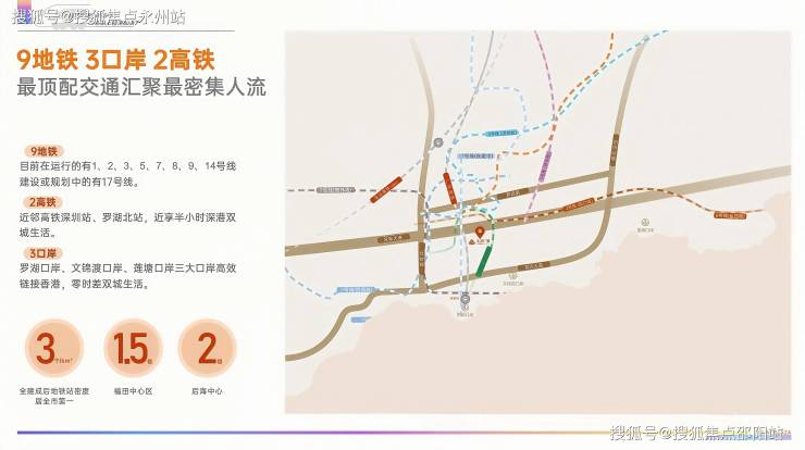 9地铁3口岸2高铁,湾区目前唯一可媲美东京地铁密度片区九地铁:1/2/3/5/7/9号线地铁环伺,未来规划建设8/11/17号线,区域地铁站密度达5个/k㎡,福田中心区1.5倍,后海中心2倍,是湾区内目前唯一可媲美东京地铁密度片区。