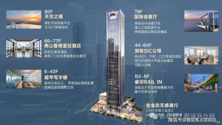 全维配套:建筑面积约𝟏𝟎万㎡睿印RAIL IN、南山香格里拉酒店、深铁SIC公馆、国际会客厅、天空之境