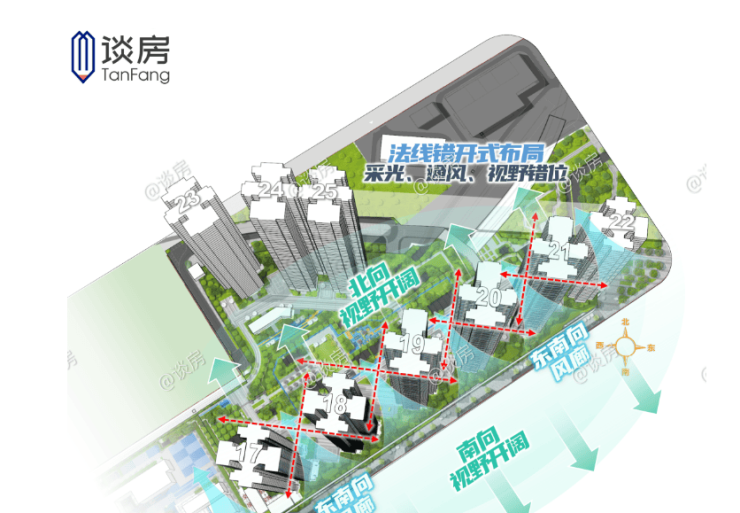 楼栋布局呈一字排布,实现人均园林最大化(绿化),以及法线错开视野通风采光一级棒