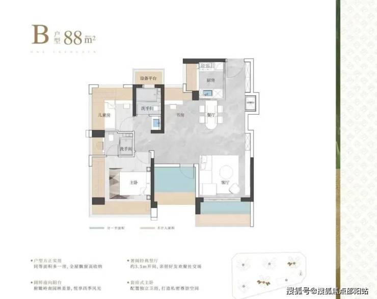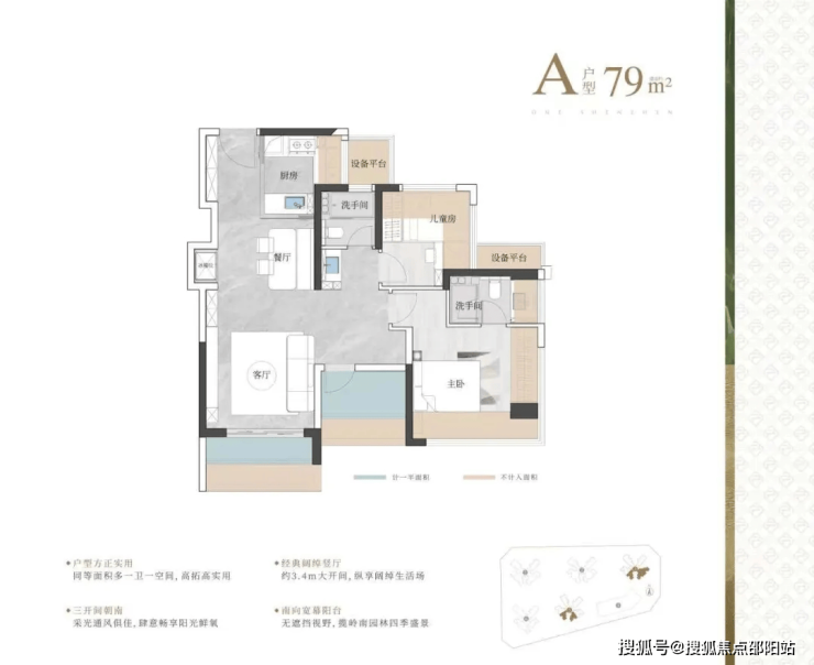 这次79平做到了三房两卫的设计,客厅开间3.4米,主卧开间3.9米,相比之前的新房产品,已经有了突破!