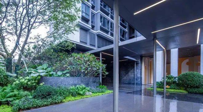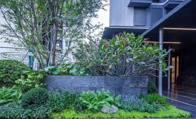 每栋楼入户大堂前设置一处特色景墙,材料使用少见的黑色乱纹浪淘沙石材,尽显入口处低调的奢华。同时结合景墙精选冬青或朴树,独特有致的造型,骨于有力的枝条,赏心悦目,再结合种植花境打造专属入户园林空间,形成入户有花有景的精致景观。