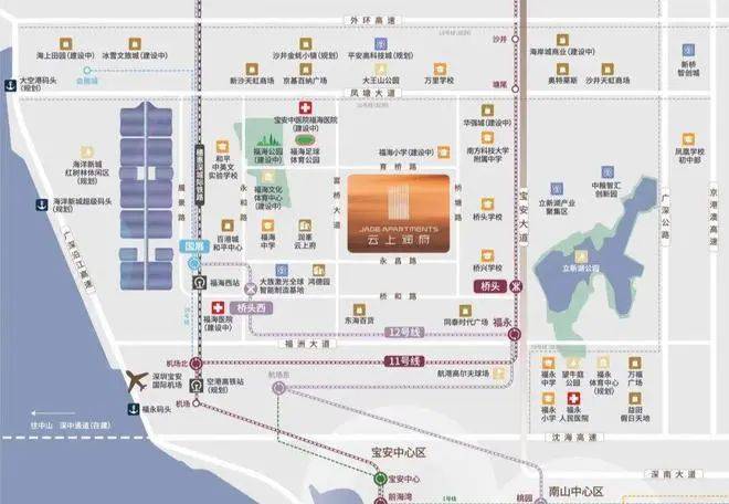 项目近邻桥头地铁站,坐上11号线,5站宝中、7站南山,轨道快线让工作和生活随意转换。