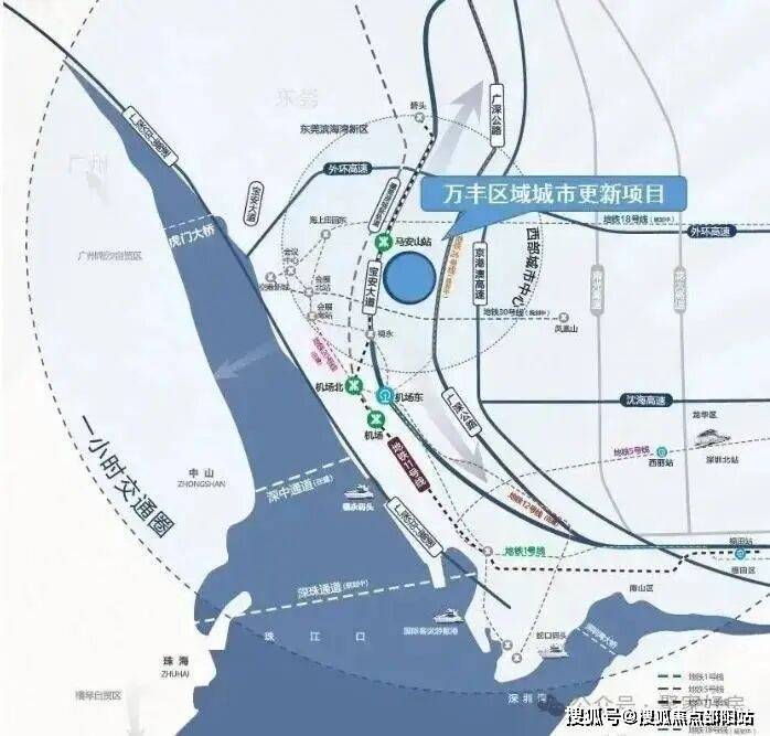 从宝安机场客运码头出发,可以到达香港、澳门、广州、珠海、中山5座城市。陆路交通已经形成“两横三纵”,“两横”是项目南北两侧的南环路、新沙路,“三纵”是项目西侧宝安大道、东侧中心路和107国道。高速方面拥有“四大高速”,广深高速、京港澳高速、广深沿江高速、外环高速等。深中通道预计2024年建成通车。