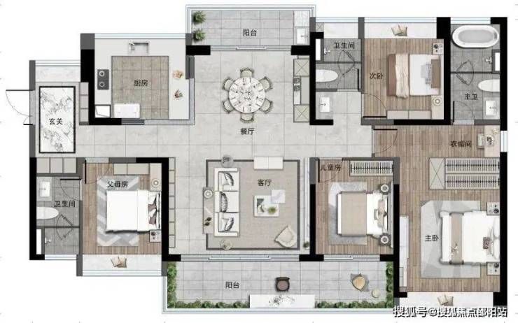 198㎡四房三卫户型,南北双阳台,全屋通透明亮,通风采光俱佳,完美给出一个“会呼吸”的家。