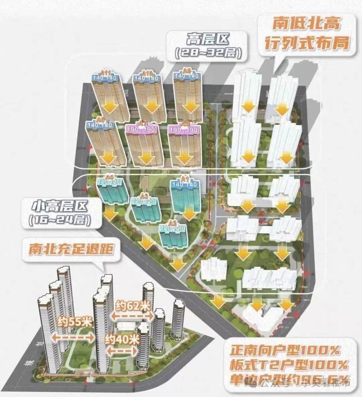 项目首期地块采用了经典的南低北高行列式布局,且所有楼栋均为T2板式独栋。