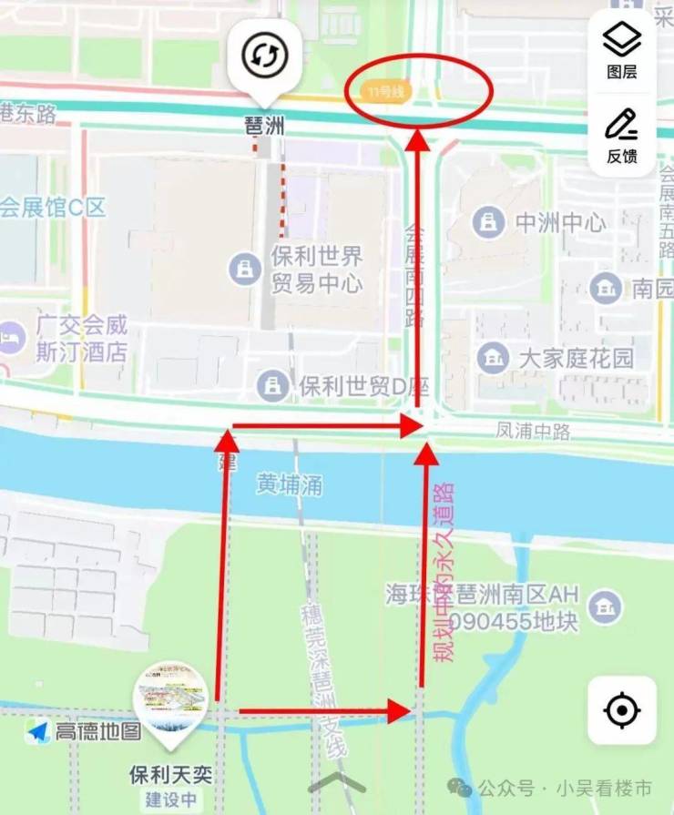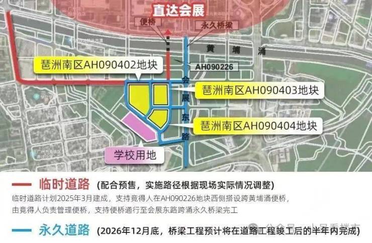 东侧规划中的永久道路,地块周边一共涉及7条,计划2026年约四季度建成,其中最关键的是附近的会展东路,可直达广交会展馆,又可串联新港东路、阅江路等,便捷通往珠江新城、金融城,后续永久道路建成,从项目开车去琶洲,仅4公里距离,基本20分钟内即可抵达琶洲,去珠城的话大概10公里左右,开车半小时。