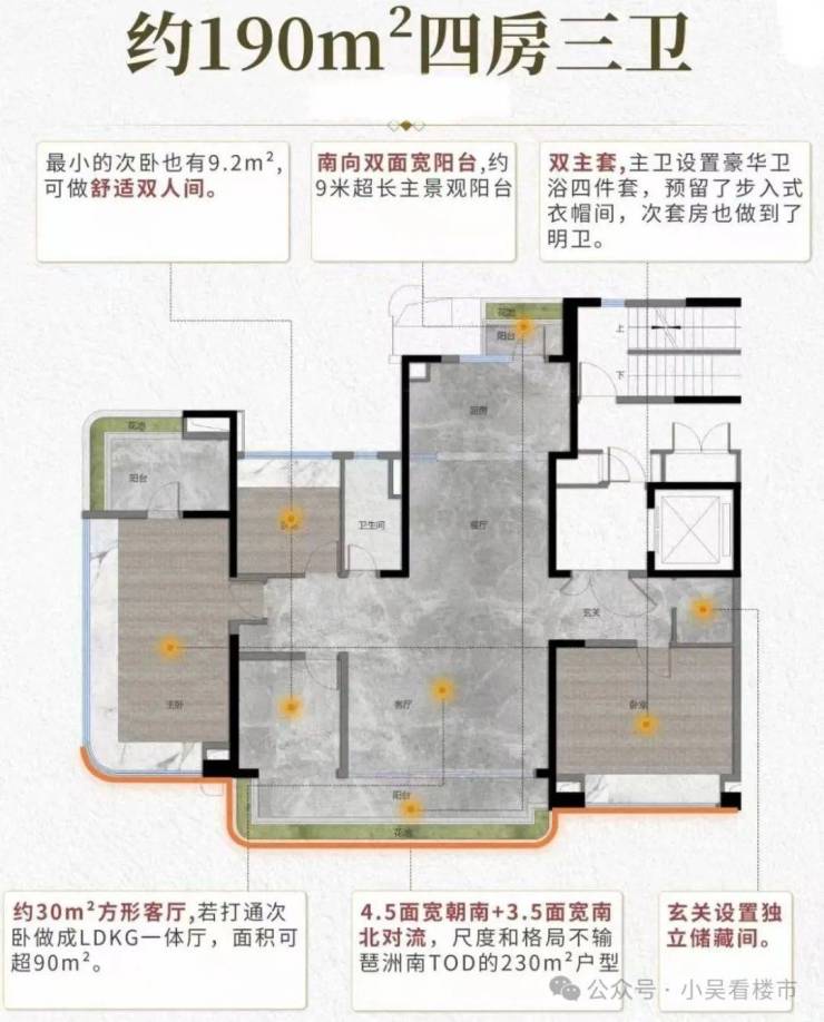 建面190平四房三卫,面宽18.2米,专梯入户,客厅开间5.7米,酒店式主卧套房,带豪华衣帽间,南北双景观阳台,约9米南向阳台,打通客厅旁的次卧可做成LDKG一体化,双卫设置了豪华卫浴四件套,总价1500万起。