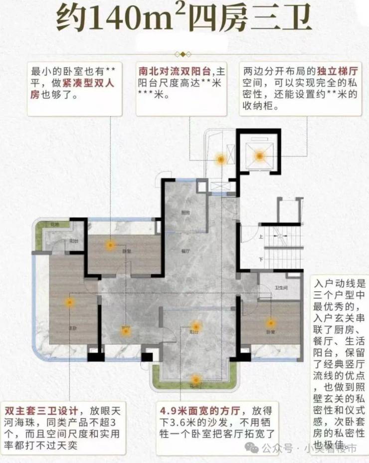 建面140平四房三卫,面宽16米,专梯入户,独立电梯厅,客厅面宽约5米,双主套三卫设计,U型厨房,140平主要分布在北侧后排高层,北边可望琶洲CBD景观,总价1000万起。