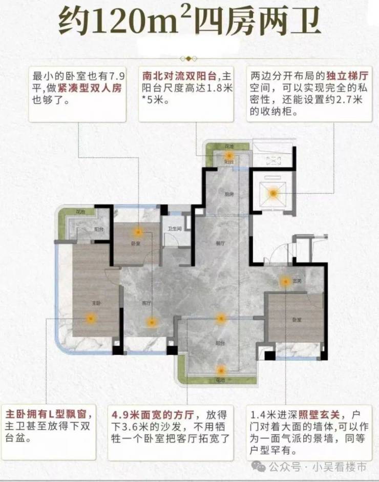 建面120平四房两卫,南北对流双阳台,面宽约15米,专梯专户,酒店式主卧套房带步入式衣帽间,带有L型飘窗,最小卧室7.9平,4.9米宽的客厅,目前这个户型以及卖完了,二期会有三栋120平的,但是现在限制新规,不知道户型会不会变。