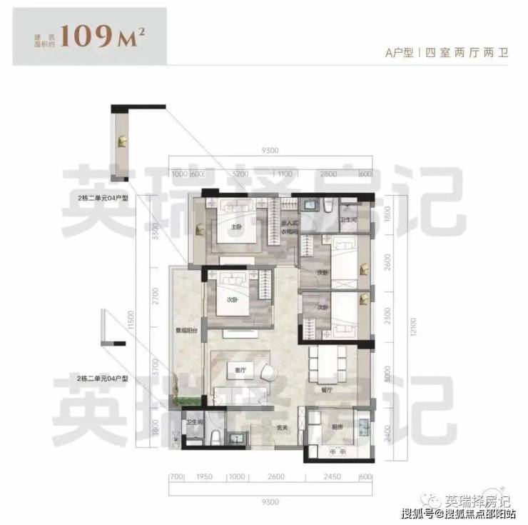 【建面约 109 ㎡A户型 4房2卫】: