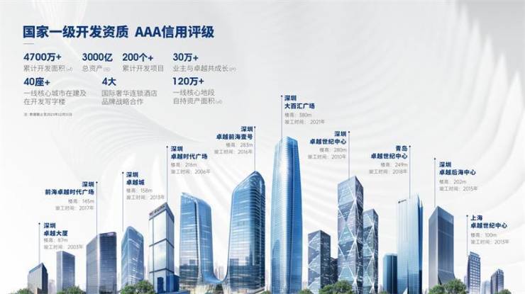 【项目介绍】PART1/品牌篇卓越集团丨CBD地标及造城专家———————————————————【优质房企】28载深厚积淀,荣获中国房地产23强,国家一级开发资质,AAA信用评级等多项荣誉。【实力卓越】战略布局全国一二线大中城市,累计开发200个+精品项目,布局地产开发、城市更新、资产运营、商企服务四大业态,成就CBD地标专家。【城市更新】多项荣誉:卓越集团作为全国第一家城市更新集团公司,荣获2020-2023年“中国房地产城市更新十强企业”TOP2等多项荣誉。开发数据:目前已完成36个立项项目,20+交地项目,布局福田岗厦、皇岗等城市核心区位。