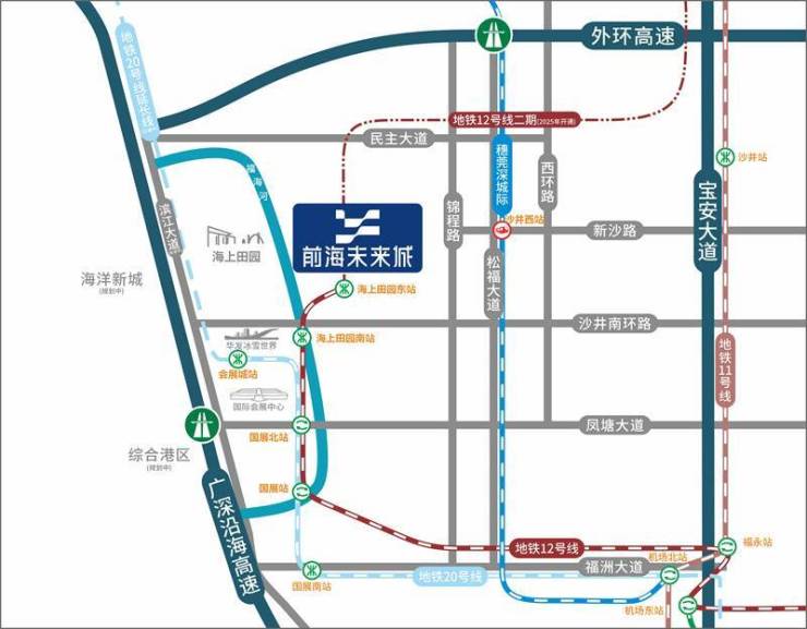 【12号线地铁口 6维立体交通】地铁口-12号线海上田园东站,便捷换乘11、20号线,快速通达宝中、南山、福田4高速-广深沿江、京港澳、沈海、外环高速3快速路-滨江大道(在建中),广深公路,宝安大道2码头-福永码头及宝安大空港码头(规划中)2城际-沙井西站(距离项目直线距离约1.5km),穗莞深城轨、深茂铁路(在建中)1航空-深圳宝安国际机场T3航站楼已启用,T4航站楼与机场第三跑道在建,直飞全球超120个城市