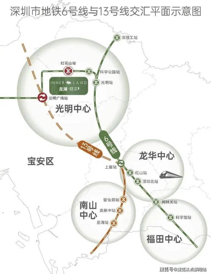 而6号线与13号线(二期在建中)形成光明中心惟一的双轨交汇——这条“黄金十字”,正是光明中心崛起的关键引擎。6号线作为深圳光明首条地铁,标志光明正式融入深圳半小时生活圈,开通当年光明人口增速全市第一;13号线(二期在建中)作为“深圳科创生命线”,将南山科技园、大科学装置区、先进制造业集聚区一线打通。