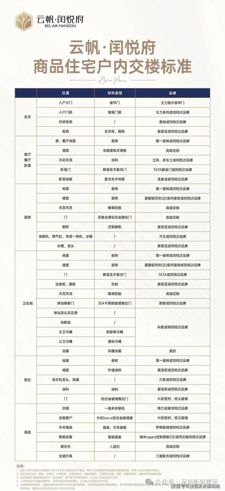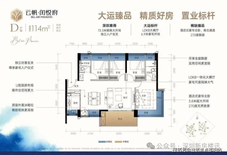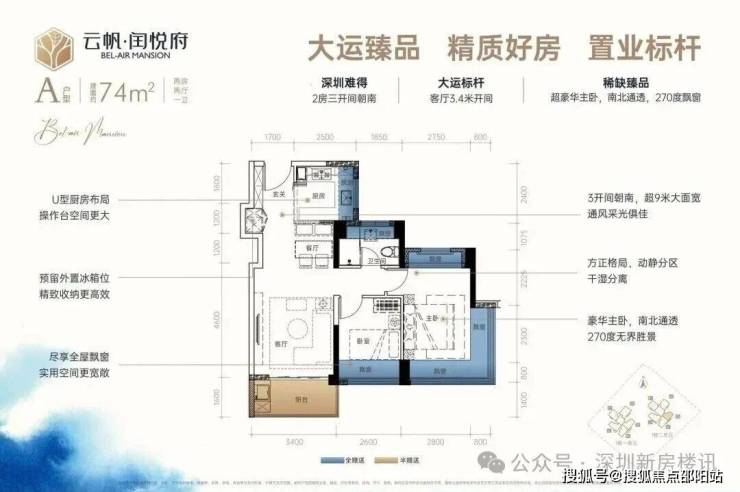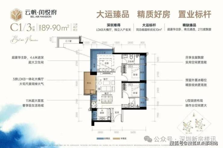 龙岗中心城,云帆·闰悦府(备案名:闰悦蓝湾公馆)于2025年10月11日取证入市,本次推出1栋1/2单元,共147套房源,面积有74m²的2房1卫,89m²的3房2卫,114m²的4房2卫户型,朝向都非常好,都是东南、西南要么南北通透的格局,备案均价4.82万/m²,备案单价4.55-5.34万/m²,总价345-610万/套,合同约定在2027年6月份带精装交付,配置了格力中央空调+方太厨电三件套(洗碗机+煤气灶+抽油烟机)+科勒卫浴+王力钢木装甲门+智能门锁。
