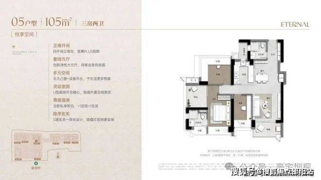 105m²的4房2厅2卫,经典竖厅格局,客厅3.4米开间,LDKB一体化大方厅,S墙设计预留冰箱卡槽位,四开间朝南,动静分区,五大凸窗+设备平台,U型厨房,卫生间干湿分离。阳台正南朝向看皇岗公园,得房率75.9%(不含赠送,套内面积80.02㎡)。